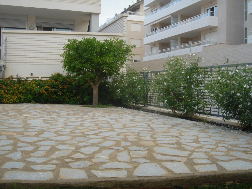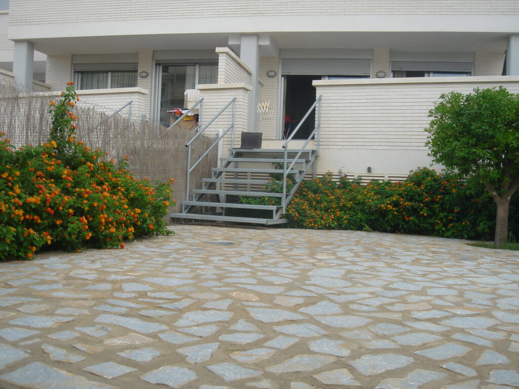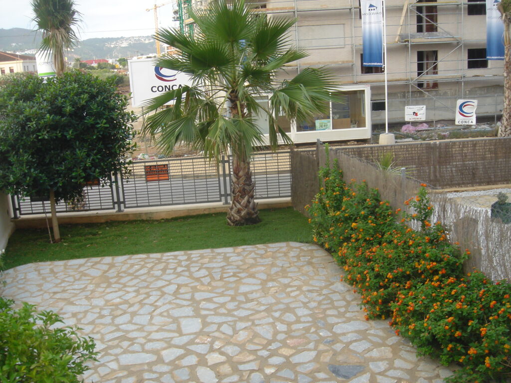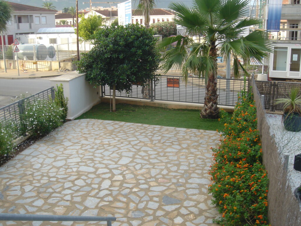 Terraza de 25 m2 con mesa y seis sillas, hamaca , tendedero y sombrilla.Bajada a través de escalera a otros 50 a 60 m2 en los que hay una parte solada de piedra y otra parte con césped artificial.