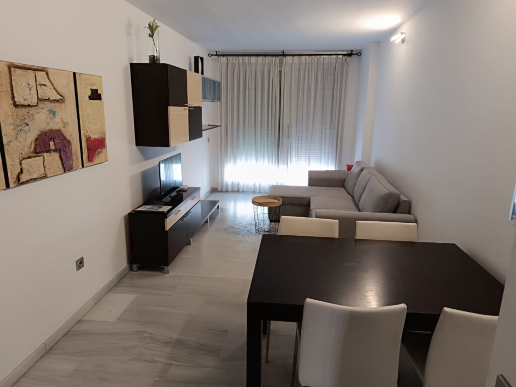 Mesa y cuatro sillas, sofá convertible, sofá individual relax y mueble con TV. - Habitaciones